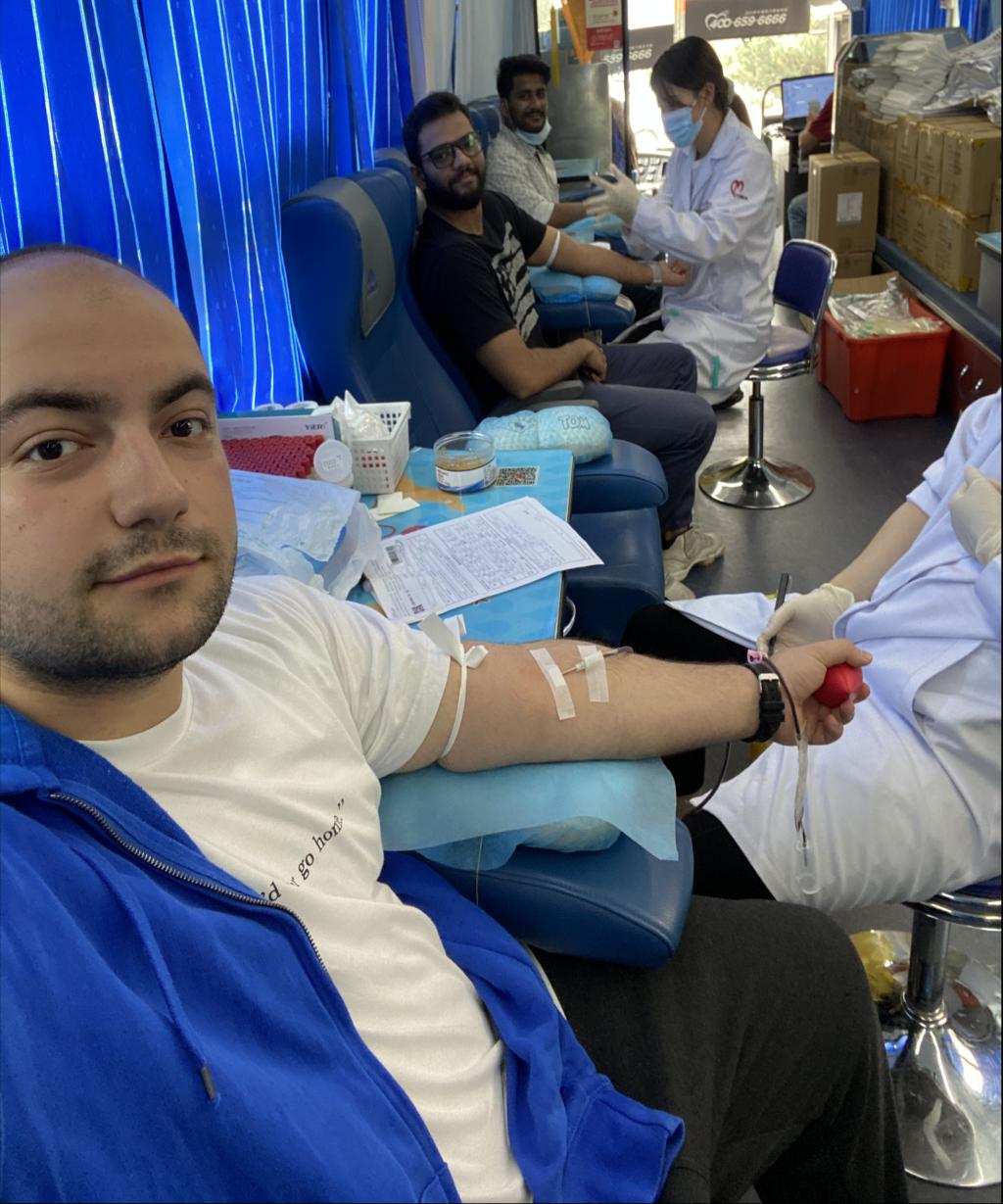 “看,这些是我每年的献血凭证”来自印度的男孩Farhan自豪地向大家展示着自己从2015年到2020年6年以来的献血凭证。献血中,一对来自也门的双胞胎姐妹Maryam和Khadega因为身体原因未能成功献血,两姐妹纷纷表示会吃胖点,明年还会再来。
