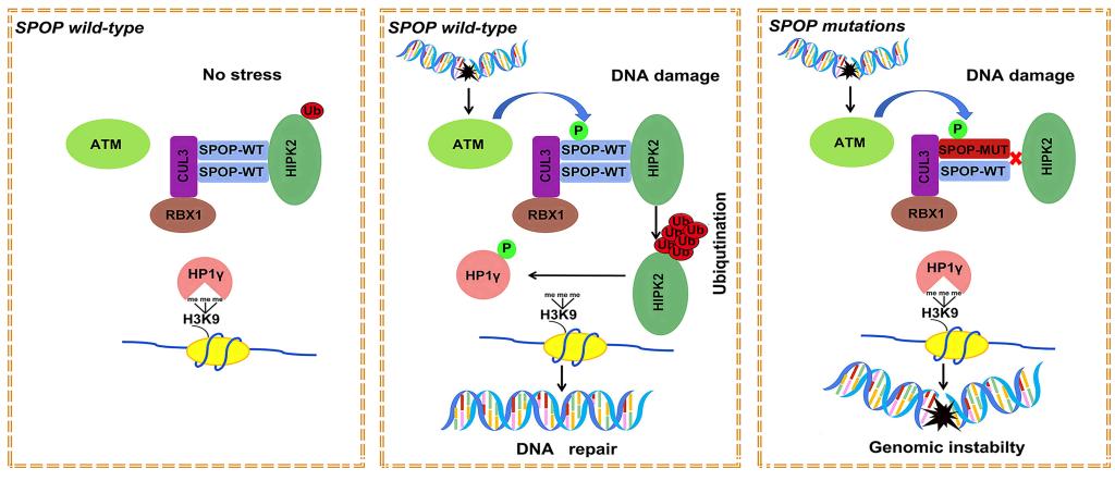 前列腺癌(Prostate Cancer,PCa)是男性泌尿生殖系统常见的恶性肿瘤之一,全球每年有超过91.3万新增病例,导致26.1万多人死亡。前列腺癌大样本基因组检测发现SPOP基因存在高频突变:SPOP突变就是原发性前列腺癌中最常见的遗传突变,这些突变在诱发前列腺基因组不稳定性中发挥关键的作用。但是其具体的作用机理并不清楚。