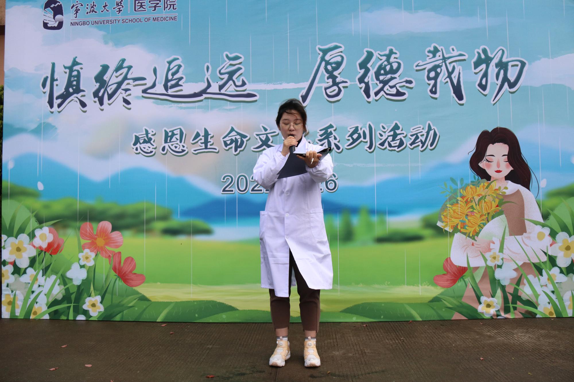 本次活动分为三部分,首先由党员代表龚露芸同学分享抗疫经历,讲述了宁波市镇海区疫情期间参与核酸检测志愿服务的故事,让同学们体会到了一名医学生身上的责任感;邬其臻作为学生代表讲述了自己入学以来学医的体会以及对遗体捐献者的敬畏;其次,全体师生默哀三分钟,并向遗体捐献者们献上鲜花,以此表达对遗体捐献者深深的敬意;最后,全体医学生重温医学生誓词,铿锵有力的宣读声不仅饱含了同学们对于遗体捐献者的崇敬与感恩,更体现了同学们立志献身医学事业的决心!
