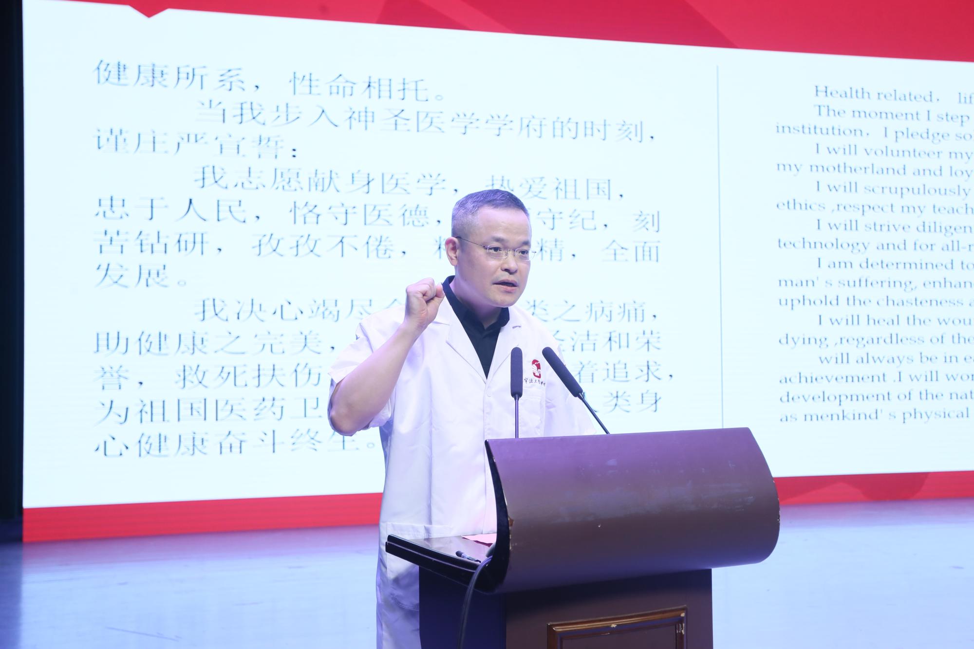 仪式最后,2022届全体毕业生在澳门六合彩-澳门六全彩开奖网 附属李惠利医院教授、主任医师沈毅带领下,紧握右手,目光坚定,庄严宣誓:救死扶伤,不辞艰辛,执着追求,为祖国医药卫生事业的发展和人类身心健康奋斗终生。