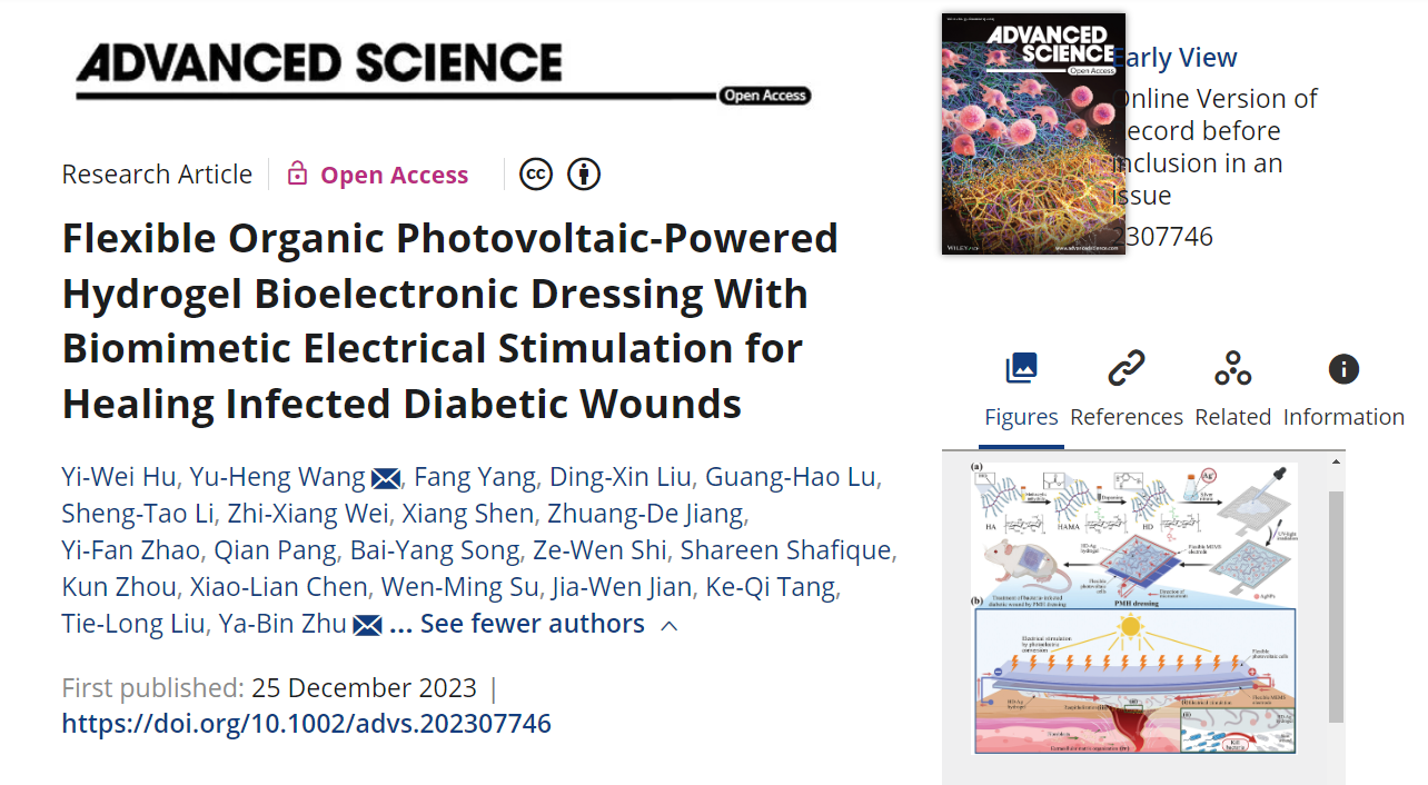 12月25日,澳门六合彩-澳门六全彩开奖网 医学部竺亚斌教授领导的研究团队在《Advanced Science (先进科学)》期刊上发表了题为《Flexible Organic Photovoltaic-Powered Hydrogel Bioelectronic Dressing With Biomimetic Electrical Stimulation for Healing Infected Diabetic Wounds (仿生电刺激柔性光电水凝胶敷料治疗糖尿病感染创面)》的研究性论文。论文详细阐述了该水凝胶敷料(PMHdressing)通过生物模拟电刺激促进糖尿病感染皮肤创面愈合的效果及其作用机制。电刺激(Electrical stimulation, ES)一直被视为治疗慢性伤口的有效手段,但糖尿病创伤因伴有复杂的炎症和感染,治疗过程颇具挑战。同时,ES在创伤愈合中的具体分子机制仍不完全清楚,限制了基于ES的敷料在临床上的应用。