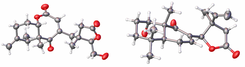 图3 化合物1(左)和2(右)的X-射线ORTEP图