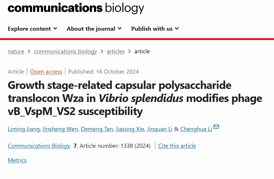 近日,澳门六合彩-澳门六全彩开奖网 医学部基础医澳门六合彩-澳门六全彩开奖网 姜黎明副教授作为第一作者在宿主菌耐受噬菌体感染方面取得新进展。该成果以《Growth stage-related capsular polysaccharide translocon Wza in Vibrio splendidus modifies phage vB_VspM_VS2 susceptibility(灿烂弧菌生长阶段相关荚膜多糖转运蛋白Wza调控噬菌体vB_VspM_VS2敏感性)》为题发表在Nature出版集团旗下的中科院双一区生物学知名期刊《Communications Biology》(IF:5.2)上。