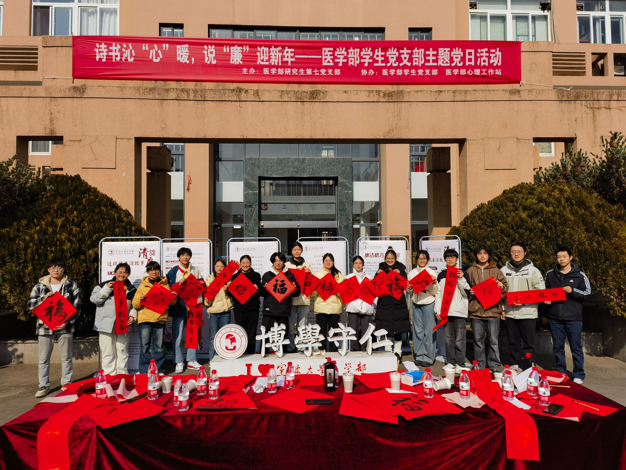 为营造医学部的党风廉政文化氛围并喜迎新年。12月31日,由医学部研究生第七党支部主办、医学部学生党支部和心理工作站协办的“诗书沁‘心’暖,说‘廉’迎新年”主题党日活动在至真楼前广场开展。活动通过廉洁诗词展示、廉洁故事分享、书写新春对联等形式吸引了众多师生参加。