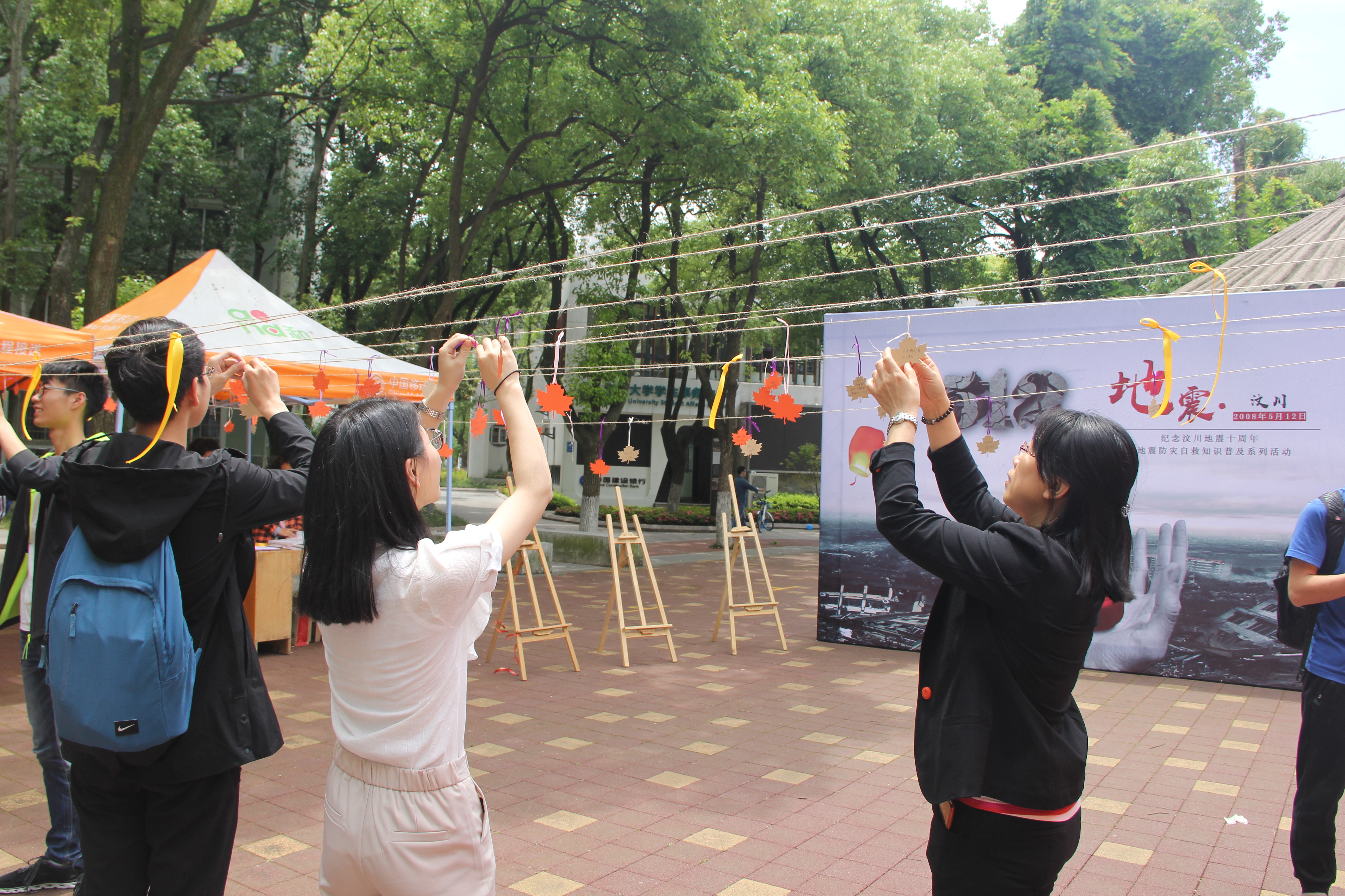 此次活动分为两个部分:防震减灾知识答题和祈福签书写。在答题区,参与活动的同学抽取一份答卷答题,现场的志愿者根据他们的作答情况,对相应知识点进行了讲解,帮助他们理解记忆。在志愿者的引导下,参与者来到祈愿签区书写、挂牵。祈愿签虽小,但心意满满。许多话萦绕在心头,但到了嘴边,都化成了一句:平平安安。参与者写好祈福签后,用丝带挂于细麻绳上。他们缓慢地系上丝带,轻轻地打结,像是一场庄严的仪式。在金色的阳光下,每一枚祈愿签都闪着希望的光芒。现场还布置了宣传小海报,介绍防震减灾、保护自我的方法,供大家学习。