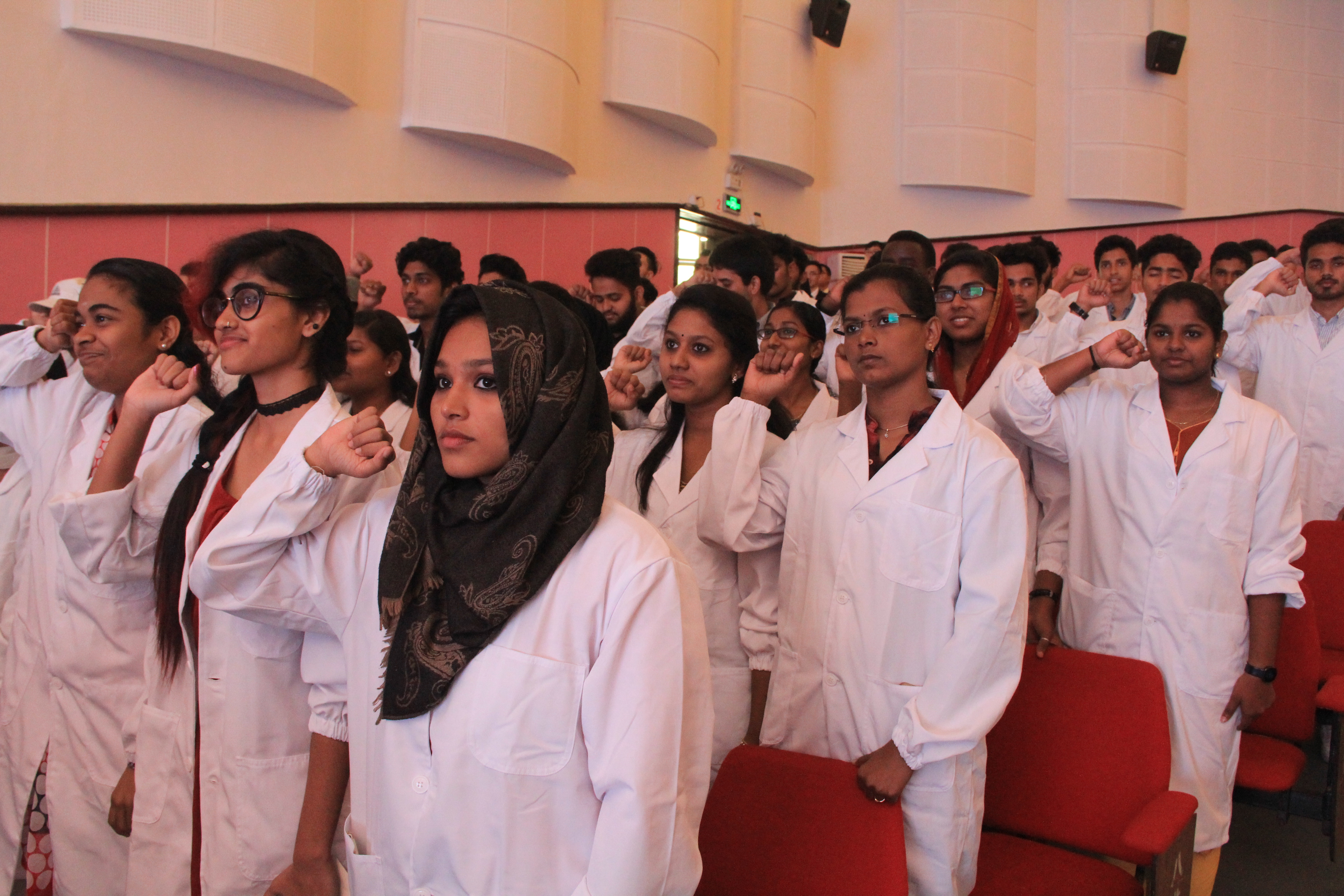 仪式上,医澳门六合彩-澳门六全彩开奖网 领导首先为新生代表授予象征着医学的圣洁和医者的使命的白大褂,中国学生和留学生新生代表分别发表了第一次穿上白大褂的感想。在医澳门六合彩-澳门六全彩开奖网 副院长杨路主任医师的带领下,全体新生立下“健康所系,性命相托”的医学生誓言。全场师生高唱《澳门六合彩-澳门六全彩开奖网 医澳门六合彩-澳门六全彩开奖网 院歌》,“师生一德,博学守仁”,歌声响彻林杏琴会堂。