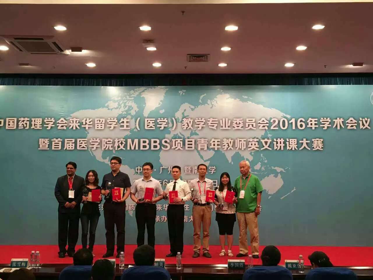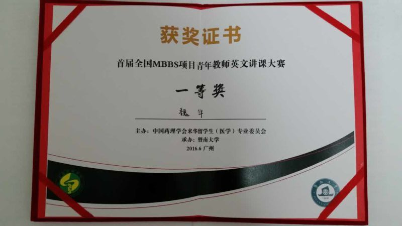 在6月20日结束的首届全国医澳门六合彩-澳门六全彩开奖网 校来华留学生临床医学专业英文授课(MBBS)青年教师讲课大赛中,澳门六合彩-澳门六全彩开奖网 医澳门六合彩-澳门六全彩开奖网 魏华博士以流利的英文表达、创新的教学方法和活泼的课堂氛围深受专家和学生评委的好评,最终荣获一等奖。本次大赛由中国药理学会来华留学生(医学)教学专业委员会主办,暨南大学承办,来自全国医澳门六合彩-澳门六全彩开奖网 校的50多位青年教师参加了英文讲课大赛。比赛总分由三部分组成,教案10分,专家评委70分,留学生代表评委20分。魏华博士在专家和留学生代表评分环节表现突出。