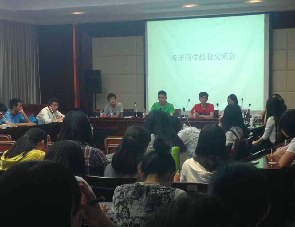 本次交流大会邀请了五位已获得攻读名校硕士资格的大五学生作为主讲人。包括保送浙大研究生的戴东君同学、以377分的高分考取郑州大学硕士研究生的韩中将同学、考取了上海交大的硕士研究生的侣孙滨和李甬芸同学等。这些优秀学子们与在场的学弟学妹分享了各自的考研经历,并从复习方法、复习时间、如何协调考研与实习等各个方面给大四同学提出了宝贵的建议。同时他们就考研与找工作时间冲突,如何取舍?教科书,参考书看几遍比较好?最后冲刺是否需要上政治辅导班?等大家关注的热点问题进行了一一地解答。