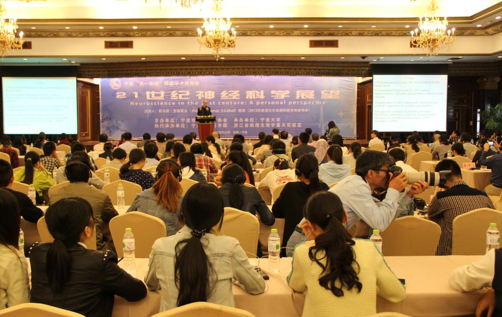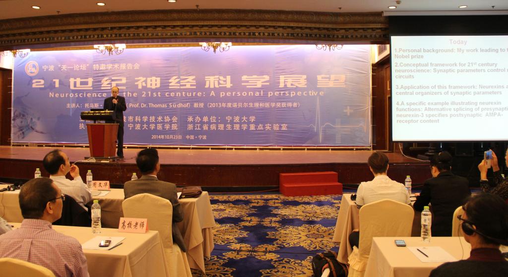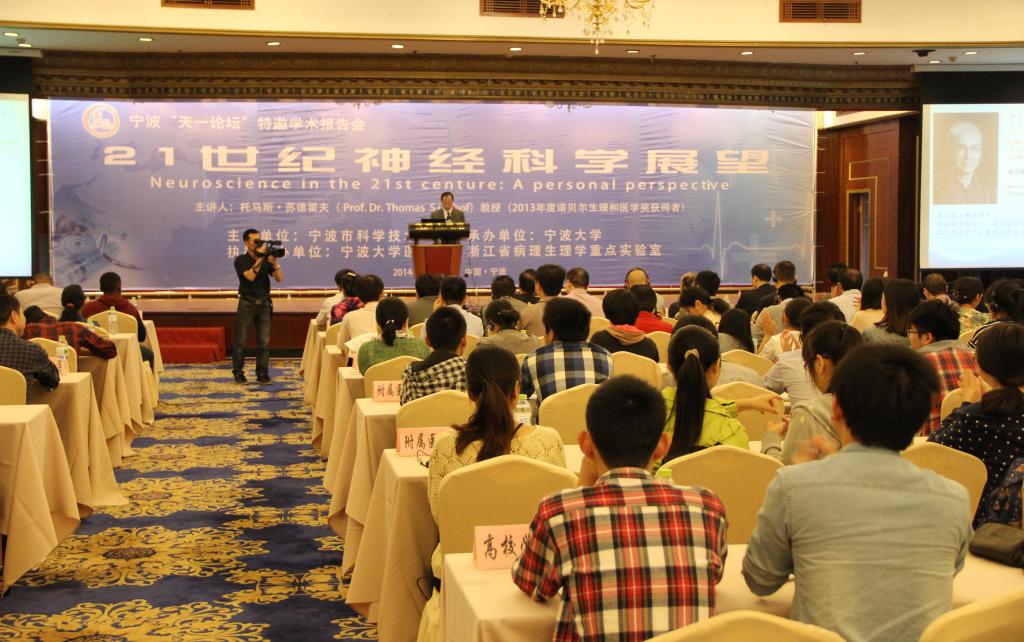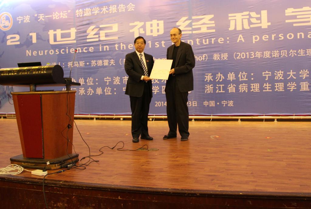 10月23日,由宁波市科学技术协会主办、澳门六合彩-澳门六全彩开奖网 医澳门六合彩-澳门六全彩开奖网 承办的《天一论坛》,特邀2013年诺贝尔生理或医学奖得主美国斯坦福大学医澳门六合彩-澳门六全彩开奖网 托马斯·聚德霍夫(Thomas Südhof)教授来甬作学术报告。本次学术活动的主题是“21世纪神经科学展望”。澳门六合彩-澳门六全彩开奖网 校长沈满洪教授出席论坛开幕式并为托马斯·聚德霍夫教授颁发了澳门六合彩-澳门六全彩开奖网 荣誉教授证书;宁波市科学技术协会主席杨志达向托马斯·聚德霍夫教授赠送了感谢状。来自我市医疗、卫生、科研以及高校等300多人,聆听了托马斯·聚德霍夫教授的精彩报告。澳门六合彩-澳门六全彩开奖网 医澳门六合彩-澳门六全彩开奖网 赵进顺教授主持了本次学术论坛。