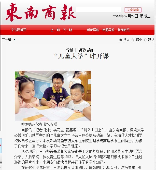 近日,由医澳门六合彩-澳门六全彩开奖网 团委和东南商报社联合开展的“儿童大学”暑期社会实践活动拉开序幕。来自医澳门六合彩-澳门六全彩开奖网 的实践队员们围绕生活中的医学知识,结合儿童认知特点,带领孩子们进行“你画我猜“等科普游戏,激发科学兴趣,增长科学知识,在游戏中帮助少年儿童获得启发和快乐。活动特别邀请了医澳门六合彩-澳门六全彩开奖网 生理与药理学系王闯博士,就“大脑:学习与记忆”的主题,面向孩子与家长们进行通俗有趣的讲解,一起探索大脑的奥秘,得到了现场大朋友小朋友的热烈响应。该活动得到了东南商报的详细报道。