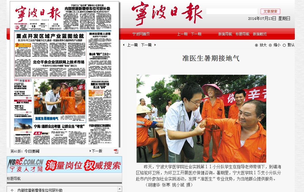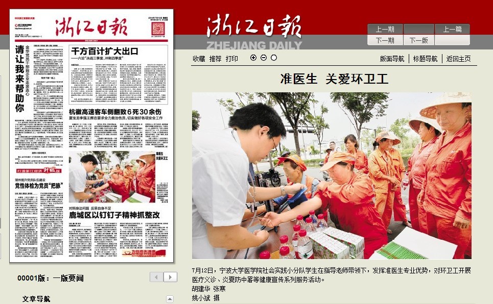 7月13日,浙江日报头版以《准医生,关爱环卫工》为题,以较大篇幅的图片报道了医澳门六合彩-澳门六全彩开奖网 学生深入农村、社区、街道、澳门六合彩-澳门六全彩开奖网 ,开展以“送医送药送清凉”为内容的社会实践活动的情况,引起了社会广泛反响。当天宁波日报头版也专题报道了澳门六合彩-澳门六全彩开奖网 实践活动情况。