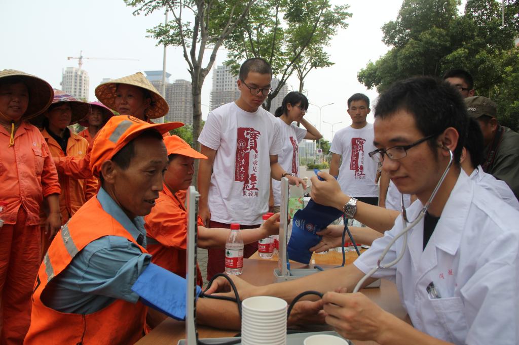 实践过程中,实践队员们为环卫工人们提供了测量血压、外科检查、脊椎腰椎等职业病咨询等服务,吸引了近40名环卫工人的热情参与。环卫师傅和阿姨们簇拥在同学们周边,争先恐后地接受检查,询问自己的身体状况。有的在得知自己健康状况良好时,开心地笑了,有的则因为血压偏高而显得忧心忡忡,实践队员们耐心地一一给出了注意事项,叮嘱他们注意生活作息和饮食,并对酷暑下如何防止中暑、预防热射病提供了实用小贴士。与此同时,实践队员们还给环卫工人送去了风油精、仁丹等防暑药品以及外伤消毒剂等常用药品。接到这些饱含医学生爱心的物品,现场的环卫工人们都开怀地笑了,他们表示:平时接受系统性体检的机会非常少,因经济条件所限通常小病挺着大病挨,希望大学生多到一线来看望关心他们,多提供这些实惠有用的健康服务。参加实践的同学们看到最美的城市美容师如此开心,感到非常满足,表示今后将长期结对环卫工人和园林养护工人等最平凡最艰苦的劳动者,用专业知识为他们的健康保驾护航。