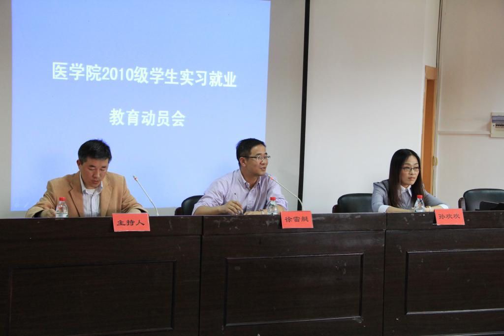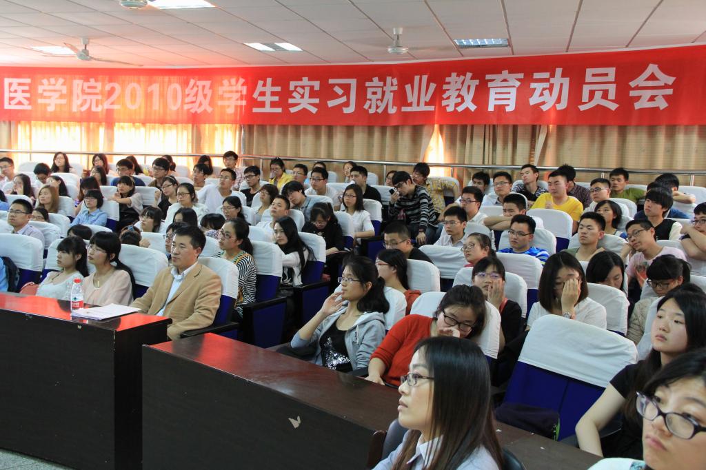 5月16日下午,医澳门六合彩-澳门六全彩开奖网 2010级学生实习就业教育动员会在海洋澳门六合彩-澳门六全彩开奖网 报告厅举行。医澳门六合彩-澳门六全彩开奖网 副院长徐雷艇,院党委副书记孙欢欢,学工办相关辅导员和2010级全体本科生参加了本次动员会。