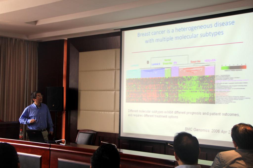 李教授从为什么研究乳腺癌细胞的起源入手,介绍了乳腺癌的多分子调控,并通过免疫荧光、转基因腺病毒载体等分子生物学方法,对小鼠的乳腺上皮细胞进行研究,阐述了乳腺细胞癌变过程以及几个重要的癌基因的分子作用机制。该研究相关成果已在cell等国际顶级学术期刊中发表。李教授指出该乳腺癌细胞的起源干细胞研究有利于乳腺癌的预防、早期诊断和癌细胞行为的预测。整个讲座李教授语言严谨生动,全场气氛热烈。