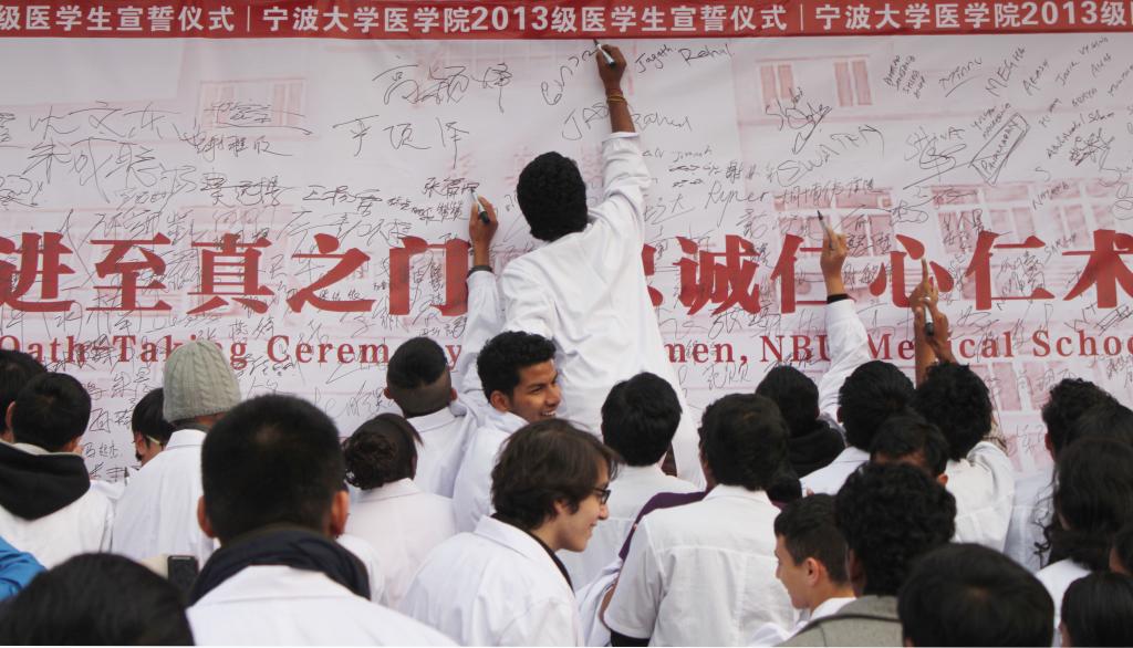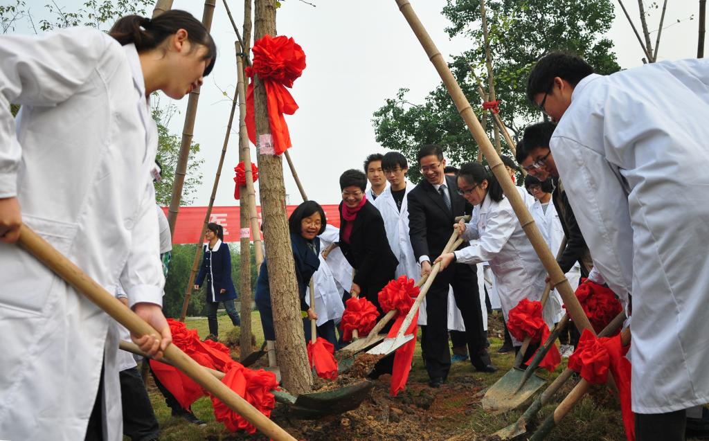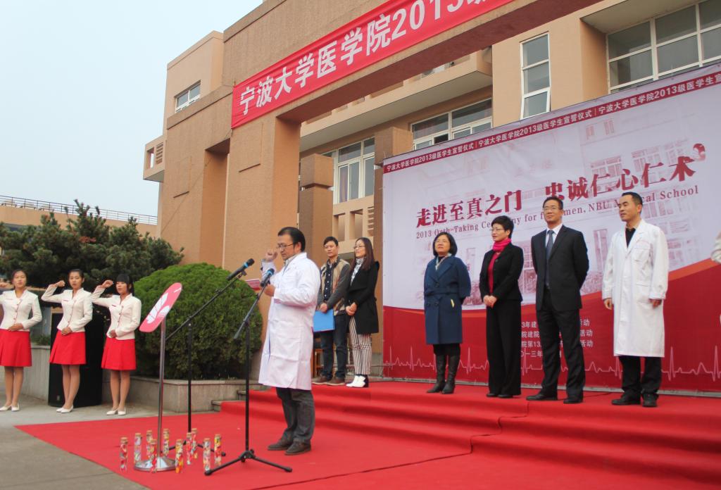 在师生齐唱《澳门六合彩-澳门六全彩开奖网 医澳门六合彩-澳门六全彩开奖网 院歌》的昂扬歌声中,现场领导嘉宾为新生代表授予白大褂。全体医学生身着圣洁的白大褂,在医澳门六合彩-澳门六全彩开奖网 王钦文副院长的带领下,进行了庄严的宣誓,郑重地把“健康所系、生命相托”的神圣使命担在肩上,立志做有担当的新一代医学生。教师代表刘爱明博士,医澳门六合彩-澳门六全彩开奖网 首届毕业生、鄞州人民医院心内科医生赵乾磊,以及新生代表顾凯波、留学生新生代表Ahmad Harb,围绕“当我第一次穿上白大褂”进行了主题演讲。师长结合自身的经历、现代医学的发展和当前医疗环境的变化,与同学们分享了各自的“白衣情结”,鼓励大家珍惜时间懂得爱,鞭策同学们无论何时何地都要坚守自己的誓言,坚守生命和健康。在“杏林寄语”环节,国际合作处陈玉涓处长、医澳门六合彩-澳门六全彩开奖网 骆巧凤书记、孙欢欢副书记等领导嘉宾为2013级中外新生送上了深切的勉励和祝福。医澳门六合彩-澳门六全彩开奖网 徐雷艇副院长发表了热情洋溢的讲话,他希望同学们既要传承“兼容并包,自强不息,务实创新,与时偕行”的宁波精神,更要牢记“博学守仁”的院训,勉励广大医学生要担任起捍卫人类健康和生命的职责,铭记医学生誓言,努力学习理论知识和专业技能,做到真才实学,实现知识、能力、素质的全面提升。最后,全体领导嘉宾来到王长来楼东侧草坪,和各班学生代表一起植下象征医学界的银杏树,并埋下寓意希望和理想的时间囊,共同培植“杏林明志,医话青春”的梦想。