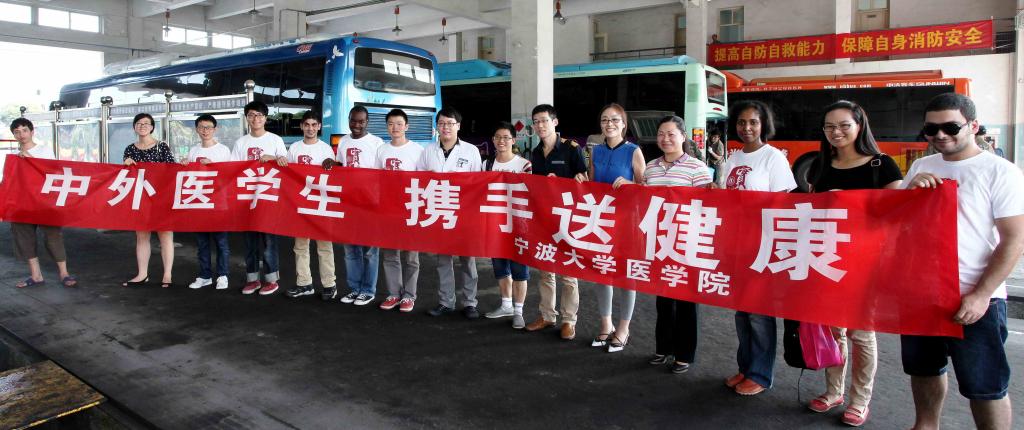 甬城的气温持续走高,宁大医澳门六合彩-澳门六全彩开奖网 的社会实践活动热度不减。7月26日下午,一支由5名留学生、3名本科生、2名研究生和1名附属医院医生组成的中外医学生社会实践小分队,走进宁波市永安公交公司,开展了以“中外医学生,携手送健康”为主题的实践服务活动。