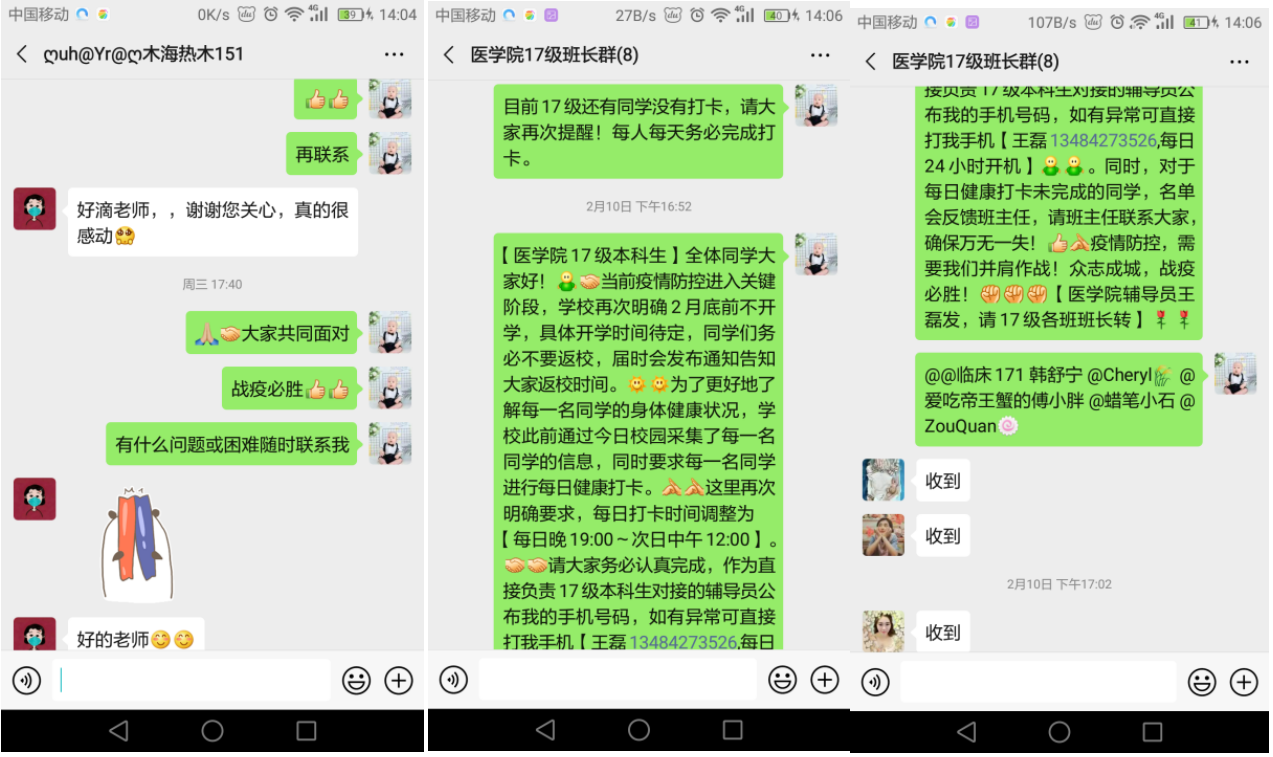同时,这也是其他辅导员的日常。自疫情发生以来,医澳门六合彩-澳门六全彩开奖网 全体学工人一直处于战斗状态。每天的生活因为有2000多个学生的陪伴而显得充实又踏实。医澳门六合彩-澳门六全彩开奖网 采取”双线制”确保学生的安全,双线制即线上加线下,线上依托今日校园每日健康打卡,了解学生动态;线下要求每个辅导员对接不同班级,同时不同辅导员对接不同班级的学生,通过微信、QQ、钉钉、电话等全天在线与学生保持密切沟通,点对点、心连心,不落一班不漏一人,提醒、记录、汇总、上报,一句句问候、一声声鼓励、一遍遍叮嘱,“谢谢老师”“老师辛苦了”便是每天最美丽的字眼。