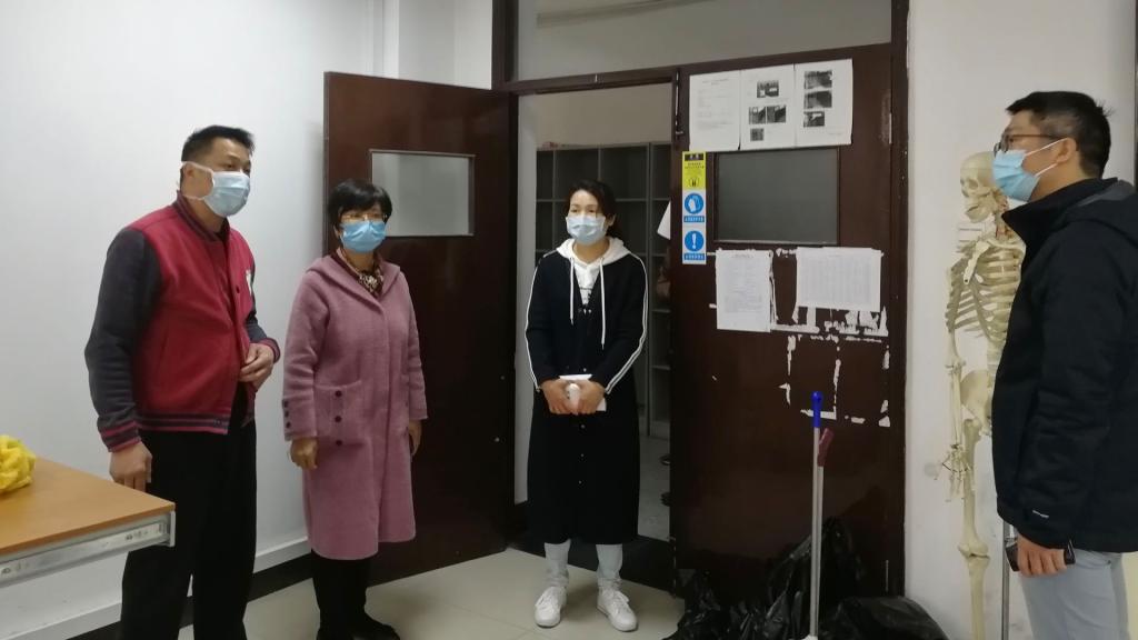 为落实校新冠肺炎疫情防控工作要求,做好春季开学准备工作,4月21日上午,医澳门六合彩-澳门六全彩开奖网 党委书记王幼芳、副院长龚朝辉带领澳门六合彩-澳门六全彩开奖网 相关部门负责人开展了春季开学防控工作的检查,对澳门六合彩-澳门六全彩开奖网 办公区域、会议室、实验室等场所进行了实地检查,主要对各个楼宇间的公共卫生区域的防护用品的配置,各办公室、实验室、电梯的卫生消杀工作进行检查,对检查过程中发现的一些问题进行了现场整改,没有到位的防护用品立即配置到位;并提醒师生按要求佩带口罩,注意开窗通风,不进行人员聚焦活动等。