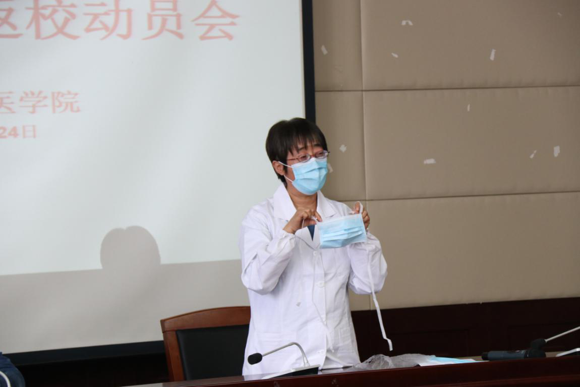 预防医学学系主任张莉娜老师现场示范正确佩戴口罩、正确洗手等防疫知识,对提高大家的思想认识以及后期对学生进行指导提供了切实的指导与帮助。