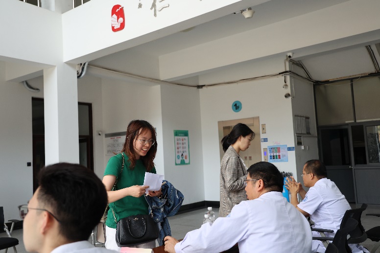 八点半开始,老师们陆续赶到现场,登记取号,在工作人员的安排下井然有序地进入大巴车内进行检查。发现问题的老师也会在现场向医生咨询,商议解决方案。