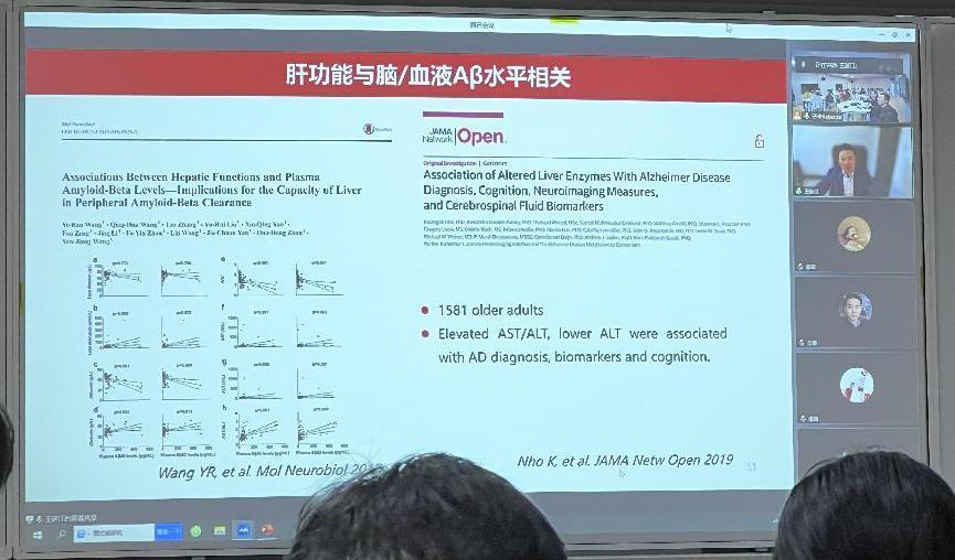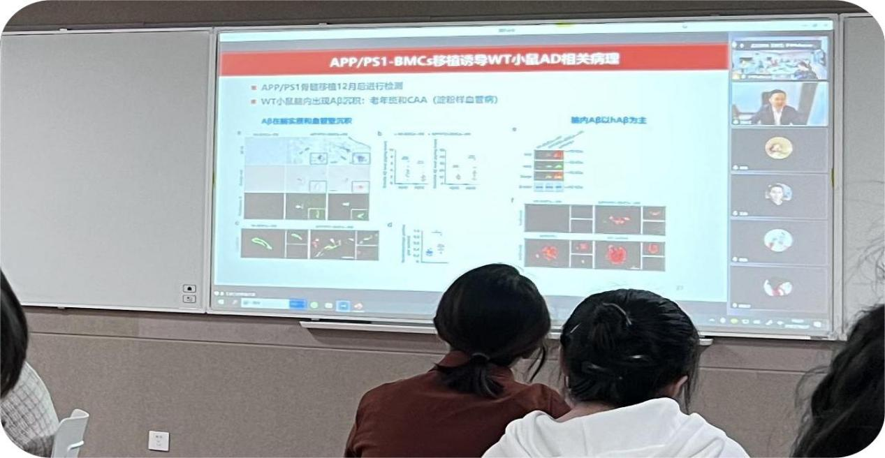 会上,对于阿尔兹海默症的发生机制、可能引起发病的因素及相关药物的研究,王延江教授进行了详细的讲解,同时细致地分析了系统疾病与AD的密切关系,并引用了一些国外相关的研究来进行说明。在视频中,王延江教授亲自展示了他的研究过程,通过建立骨髓移植模型,发现血细胞产生的Aβ对AD发病机制的贡献。从APPswe/PS1dE9转基因小鼠移植到3月龄野生型(Wt)小鼠体内的骨髓细胞(BMCs)在血液中连续表达人Aβ,移植后12个月,3月龄具有Wt-BMC的APPswe/PS1dE9小鼠的骨髓重建降低了血液Aβ水平,并减轻了AD模型小鼠的脑Aβ负荷,神经元变性,神经炎症和行为缺陷。报告后,王延江教授也与同学们进行互动答疑,场面热烈。