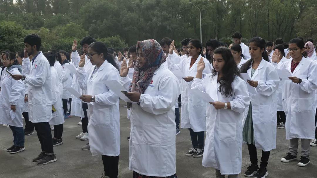 杏林见证誓言,白衣承载使命,五年医学本科教育,以医学生宣誓开始学业和完成学业是医澳门六合彩-澳门六全彩开奖网 的一大传统和特色,这个传统已经坚持了20年,着眼于学生医德医风教育、人文素养提高。随着澳门六合彩-澳门六全彩开奖网 国际化办学的推进,自2012年起,采用中英文双语模式进行。该活动是澳门六合彩-澳门六全彩开奖网 校园文化“一院一品”品牌项目,也是医学生在学业和职业生涯中的一场具有特殊意义的精神洗礼,为师生关注和称道。