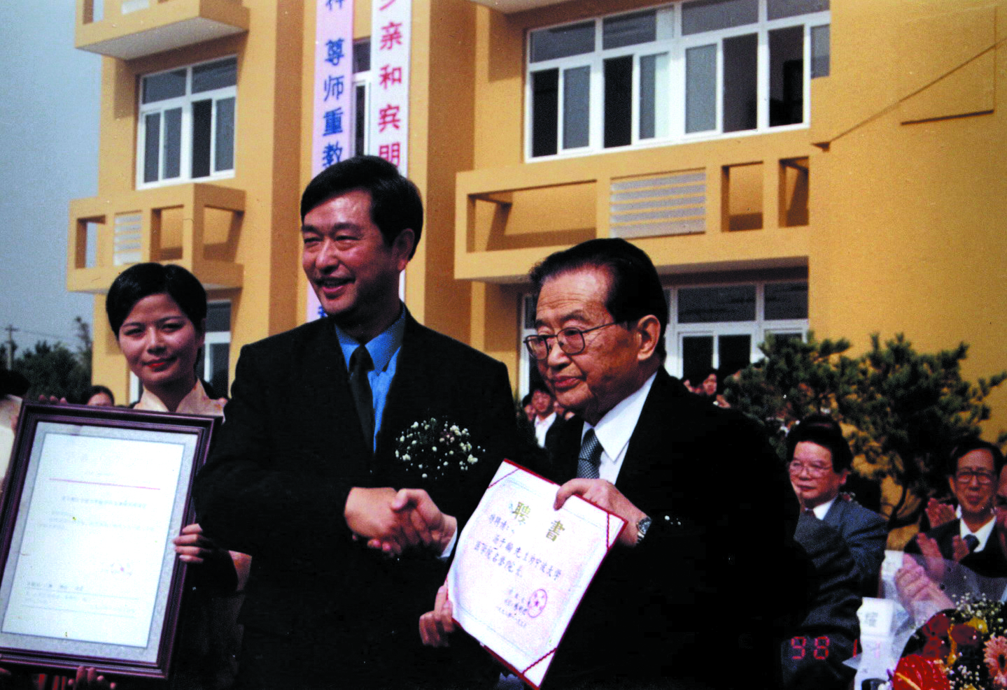 1998.11.03校党委书记李从军向汤于翰先生颁聘书,汤先生愉快接受担任宁大医澳门六合彩-澳门六全彩开奖网 名誉院长。