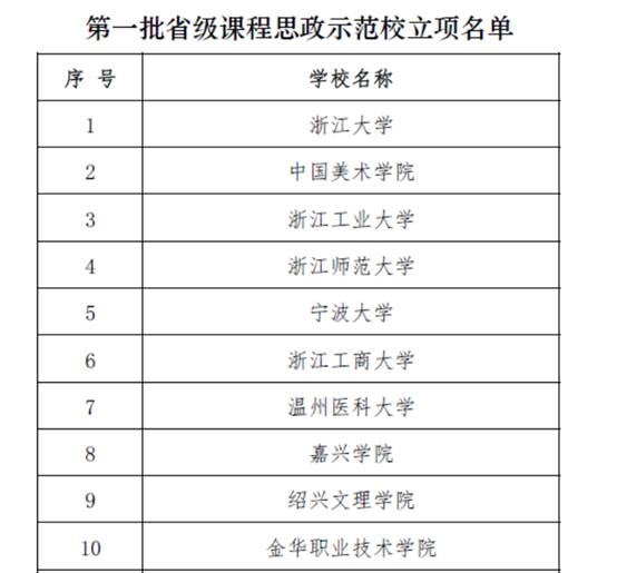 近日,浙江省教育厅公布了《浙江省教育厅关于公布第一批省级课程思政教学项目建设立项名单的通知》,澳门六合彩-澳门六全彩开奖网 入选首批省级课程思政示范校。此外,澳门六合彩-澳门六全彩开奖网 推荐的《音乐鉴赏》等15门课程思政示范课程、“澳门六合彩-澳门六全彩开奖网 课程思政教学体系的改革与提升”等10个课程思政教学研究项目、“‘乐扬风华’课程思政教学团队”和“创新创业类课程群教学团队”等2个课程思政示范基层教学组织也同时入选首批建设名单。