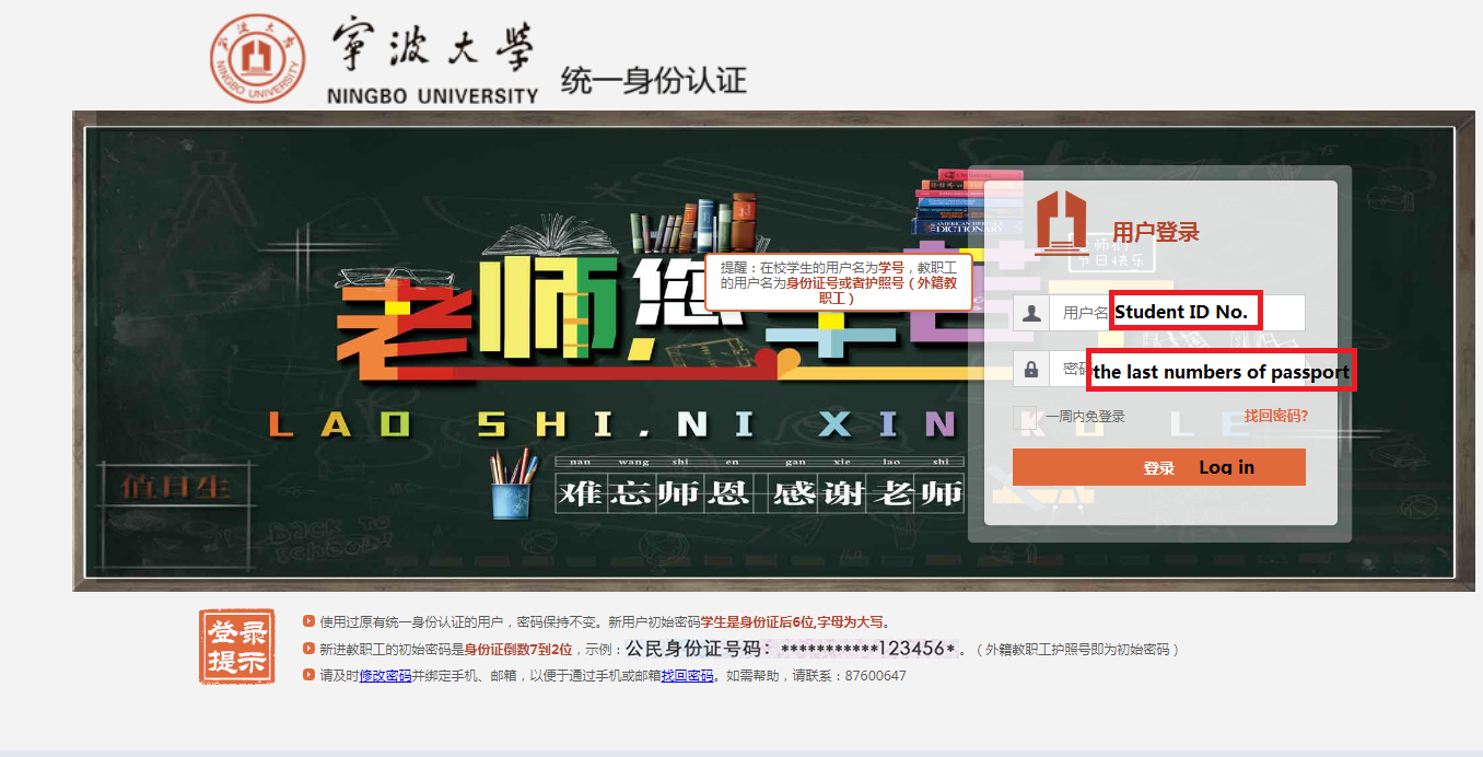 Step2. Log in with your “Student ID Number” and “the last six numbers of passport”.