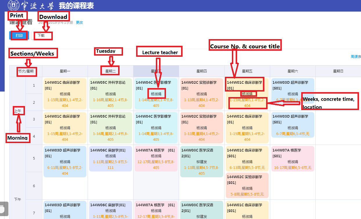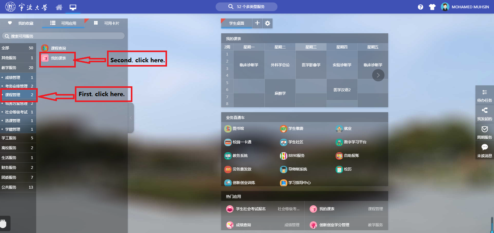 Step5.First, click “课程管理”(Courses Administration); then click “我的课表”(My Class Schedule).