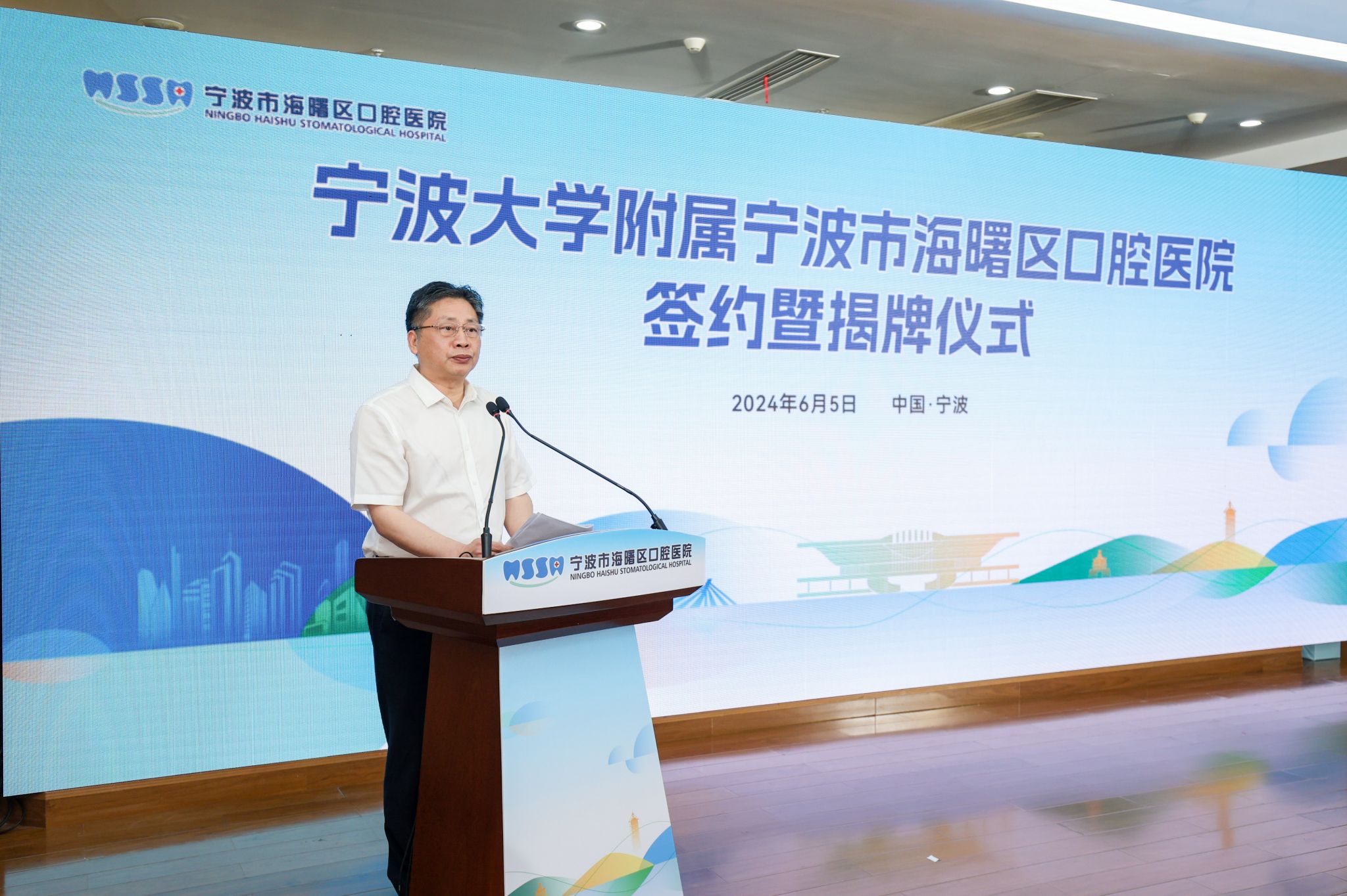 Zhang Zhenzhu spoke at the establishment ceremonies of both teaching bases. He first introduced the achievements and talent cultivation status of the university and the Health Science Center and expressed gratitude to the governments of Haishu District and Ninghai County for their care and support for Ningbo University. He set forth three expectations for school-locality cooperation: seize opportunities and act proactively, utilizing the teaching base platforms to continuously improve the quality of medical talent cultivation and fully leverage its own advantages to support and help the teaching bases enhance their teaching, research, and discipline construction levels; build together and share to achieve improvement, with hospitals deepening connotation construction and quality enhancement, realizing new leapfrog development; and school-locality cooperation for common development.