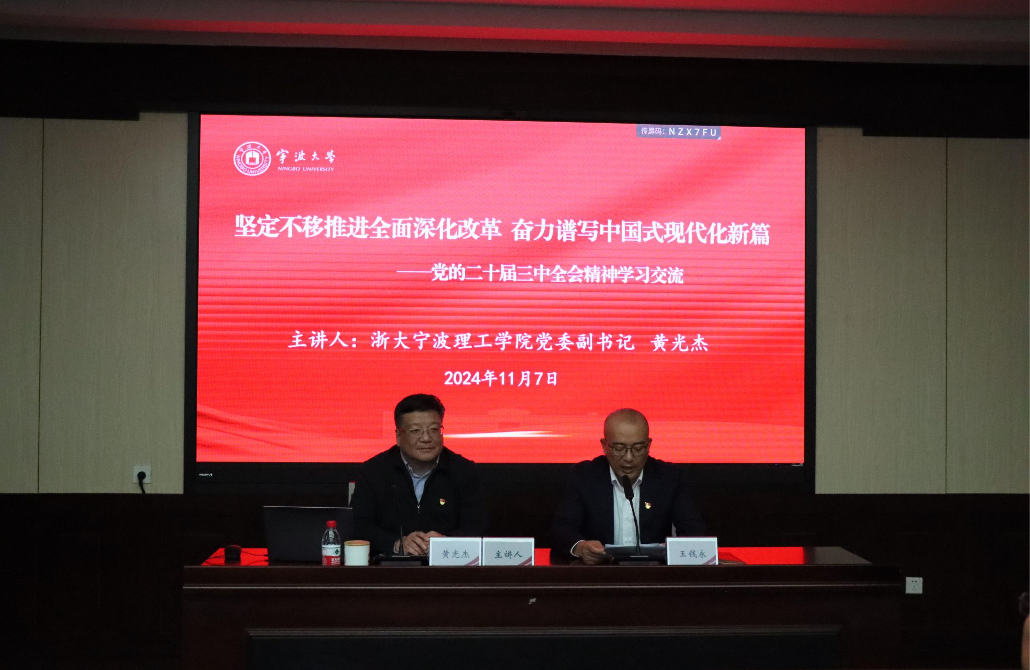 On November 7th, the Party Committee of the Ningbo University Health Science Center held an expanded central group study session for theoretical learning, inviting Huang Guangjie, Deputy Secretary of the Communist Party Committee of Ningbo Institute of Technology, Zhejiang University, to deliver a special guidance on the spirit of the Third Plenary Session of the 20th Central Committee, titled "Unwaveringly Advancing Comprehensive Deepening of Reforms and Vigorously Writing a New Chapter of Modernization with Chinese Characteristics." The meeting was chaired by Wang Qianyong, the standing deputy secretary of the Party Committee, and all faculty members attended.