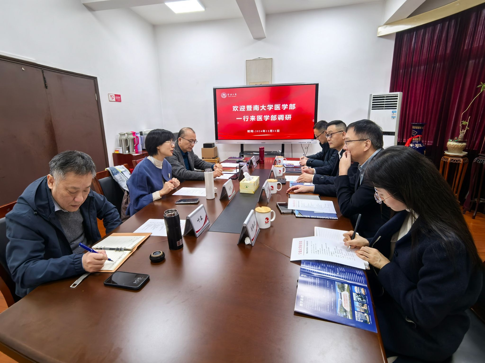 On the morning of December 11th, Meng Xianjun, Minister of Medical Work of the Party Committee of Jinan University; Chen Guobin, Dean of School of Basic Medical Sciences and Public Health; Chang Wei, Party Committee Secretary of School of Stomatology, and others came to our university's medical department for research. Liu Yu, Executive Director of the Medical Department; Wang Qianyong, Executive Deputy Secretary of the Party Committee; Ye Meng, Deputy Director, and others received the research team.