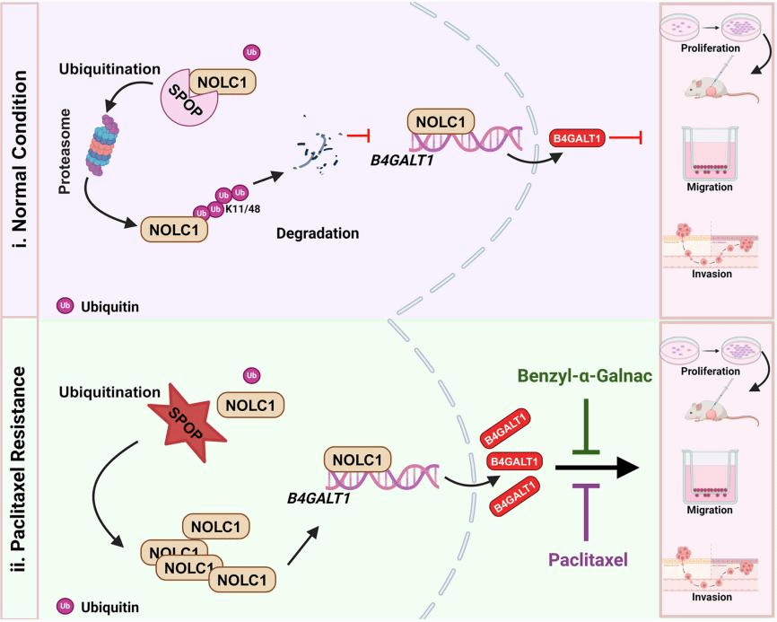 Effective treatment for paclitaxel-resistant patients remains a significant challenge. The research team discovered that NOLC1 (nucleolar and coiled-body phosphoprotein 1) is highly expressed in paclitaxel-resistant endometrial cancer (ECa) cells and pathological tissues of ECa patients, promoting cancer cell development and progression. Mechanistically, dysfunction of the E3 ubiquitin ligase SPOP leads to dysregulated ubiquitination and degradation of NOLC1. Aberrantly elevated NOLC1 acts as a transcription factor to activate B4GALT1 expression, ultimately causing O-dysglycosylation and driving endometrial cancer progression. Additionally, combining O-glycosylation inhibitors with paclitaxel effectively enhances drug sensitivity in resistant cells.