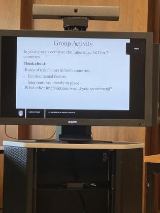 本周依旧互动满满, 印象最深的是一位老师带我们去观看了 ubc 内的残疾人友好设施,比如楼梯旁的斜坡,以实践知识展现了公共设施与健康的关系。