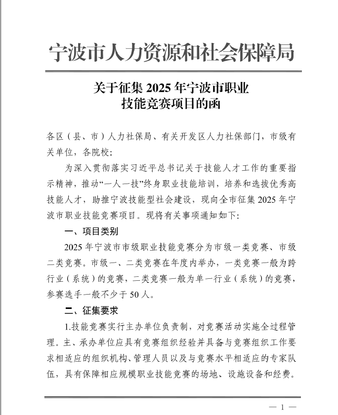 转发宁波市人社局关于征集2025年宁波市职业技能竞赛项目的有关通知,一类二类赛事均限申报1项,有意向申报者请于2025年2月17日前填写附表,并将PDF盖章件及EXCEL电子稿同时发送至康冬丽钉钉。